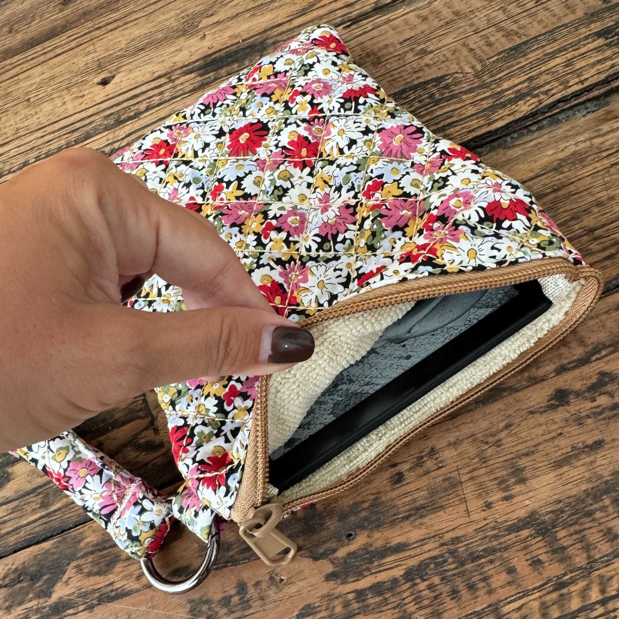Featuring a charming quilted floral exterior and a beige terry interior, this pouch offers both beauty and functionality. The padded interior provides a layer of protection against bumps and scratches, making it perfect for carrying your eReader, small notebooks, or even travel accessories.